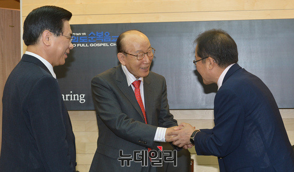 홍준표 자유한국당 대선후보가 9일 오전 서울 여의도순복음교회에서 조용기 여의도순복음교회 원로목사와 악수를 나누고 있다. 이날 홍 후보는 예배를 마치고 노재봉 전 국무총리를 예방할 예정이다. (사진=공동취재단)