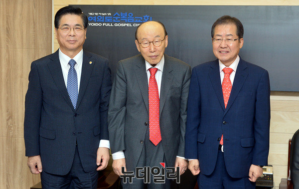 홍준표 자유한국당 대선후보가 9일 오전 서울 여의도순복음교회에서 조용기 여의도순복음교회 원로목사, 이영훈 담임목사와 기념 촬영을 하고 있다.이날 홍 후보는 예배를 마치고 노재봉 전 국무총리를 예방할 예정이다. (사진=공동취재단)