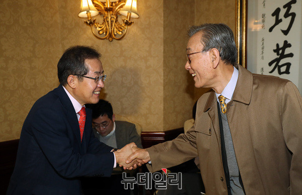 홍준표 자유한국당 대선후보가 9일 오전 서울 여의도의 한 식당에서 노재봉 전 국무총리와 악수를 나누고 있다. 이날 홍 후보는 앞서 조용기 여의도순복음교회 원로목사와 이영훈 한국기독교총연합회장을 예방했다. (사진=공동취재단)