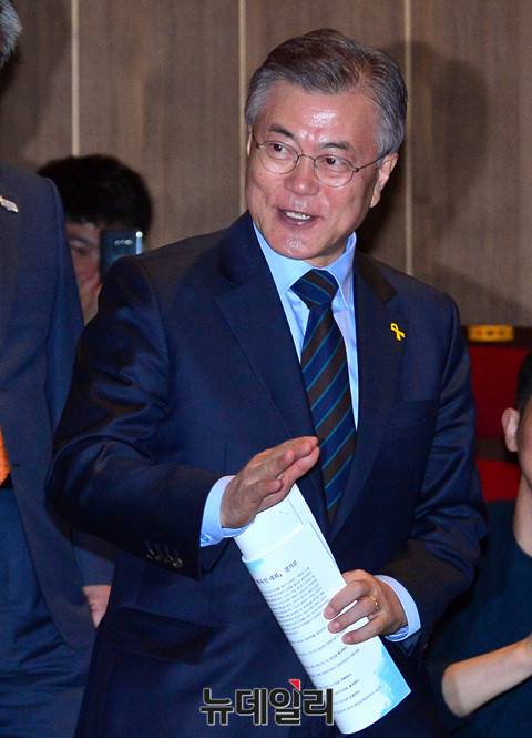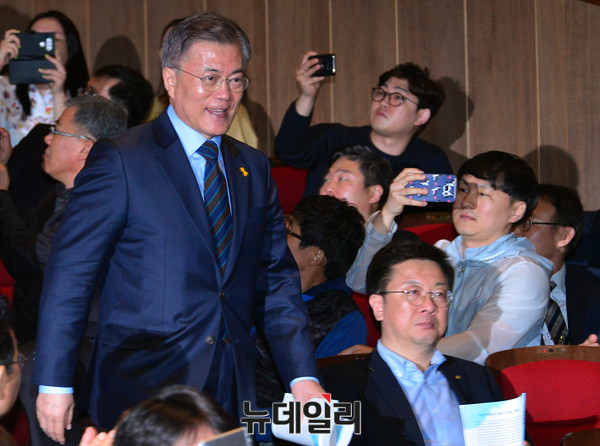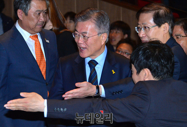 문재인 더불어민주당 대선후보가 9일 오후 서울 올림픽공원 우리금융아트홀에서 열린 '2017 대한민국 체육인대회'에 입장하고 있다.