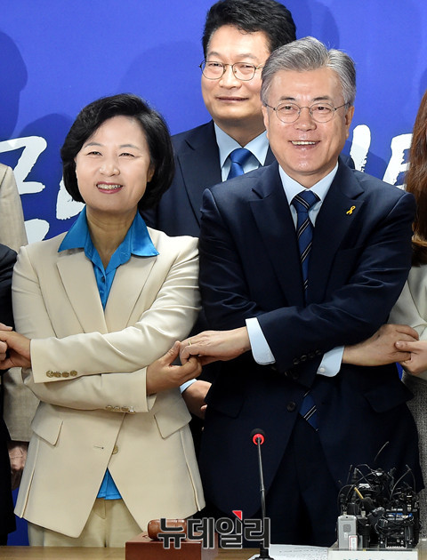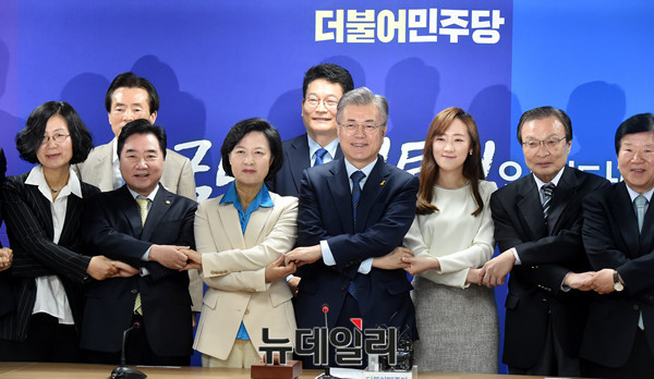문재인 더불어민주당 대선후보가 10일 오전 서울 여의도 더불어민주당사에서 열린 첫 '국민주권 선거대책위원회의'에 참석해 추미애 대표, 이해찬 공동선거대책위원장 등 관계자들과 기념사진을 촬영하고 있다.