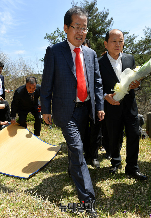 홍준표 자유한국당 대선후보가 10일 오전 창녕군 남지읍에 위치한 모친 묘를 찾아 헌화하고 있다. 홍 후보는 이날 경남도청 신관 대강당에서 열린 제35대·제36대 도지사 퇴임식 직후 선친과 모친 묘를 각각 찾아 참배했다. (경남 창녕=뉴데일리 정상윤 기자)
