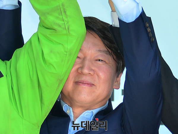 안철수 국민의당 대선후보가 10일 오후 경기도 하남시 신장동에서 열린 유형욱 하남시장 후보 유세장에서 손을 들어 보이고 있다.
