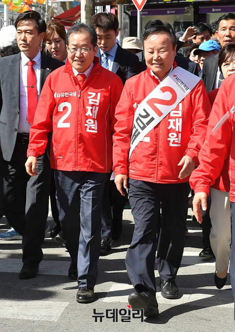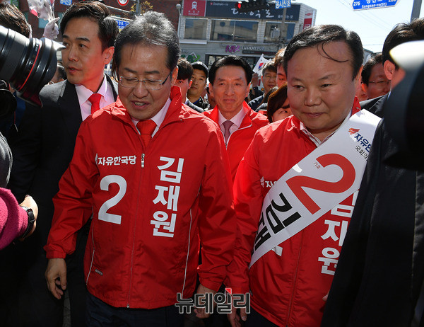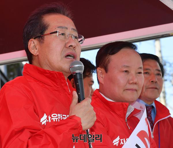 홍준표 자유한국당 대선후보가 10일 오후 경북 상주시 서문사거리를 찾아 상주·의성·군위·청송 지역구에 출마한 김재원 후보의 지지를 호소하고 있다. 김관용 경북지사도 서문사거리를 방문해 홍 후보의 연설을 지켜봤다. (경북 상주=뉴데일리 정상윤 기자)
