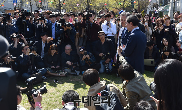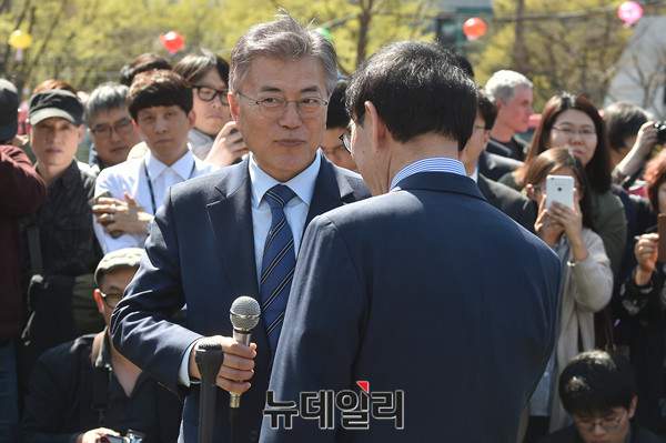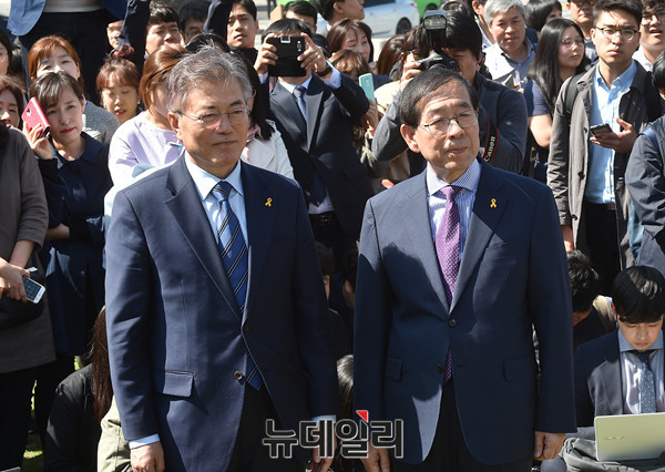 문재인 더불어민주당 대통령 후보와 박원순 서울시장이 10일 오후 서울 광화문 광장을 둘러보고 광장 재구조화 사업관련 대화를 나누고 있다.