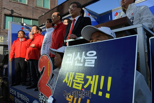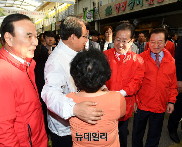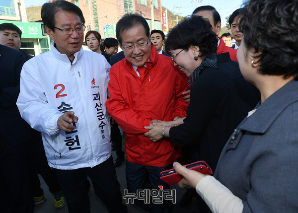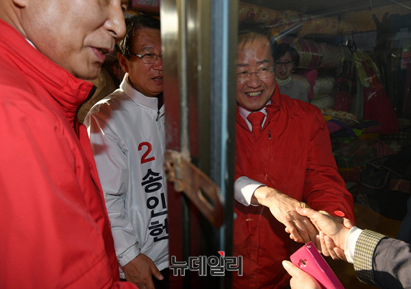 홍준표 자유한국당 대선후보가 괴산군수에 출마한 송인헌 후보와 10일 오후 충북 괴산군 산막이시장을 방문해 시민들과 악수를 나누고 있다. 홍 후보는 앞서 이날 오후 경북 상주시를 방문해 김재원 국회의원 후보를 지원하기도 했다. (충북 괴산=뉴데일리 정상윤 기자)