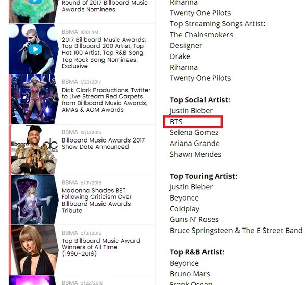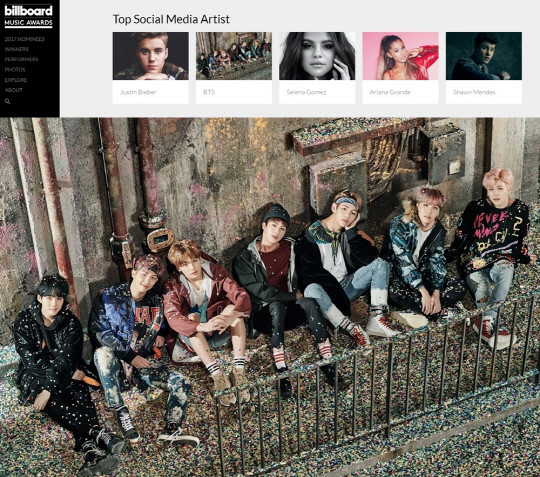 미국 빌보드는 현지시각으로 10일 홈페이지와 SNS를 통해 오는 5월 21일 미국 라스베이거스에서 열리는 '2017 미국 빌보드 뮤직 어워드'의 각 부문 후보를 공개했다. 이 중 방탄소년단은 '톱 소셜 미디어 아티스트(Top Social Media Artist)' 부문의 후보 가수로 이름을 올렸다.