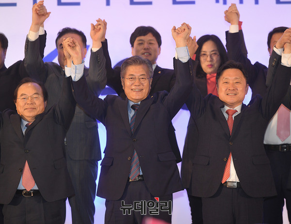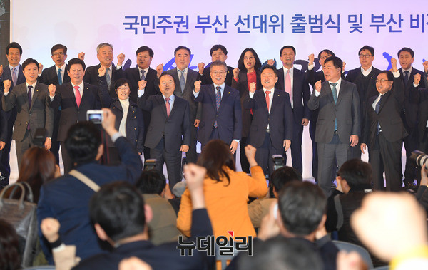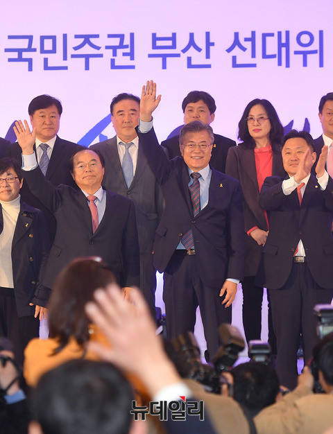 문재인 더불어민주당 대선후보가 11일 오후 부산 벡스코 컨벤션홀에서 열린 부산선대위 출범 및 부산 비전 발표식에서 선대위원들과 손을 맞잡고 있다. 문 후보는 이어 범어사 더문캠 불교특위 출범법회에 참석할 예정이다. (부산=뉴데일리 정상윤 기자)