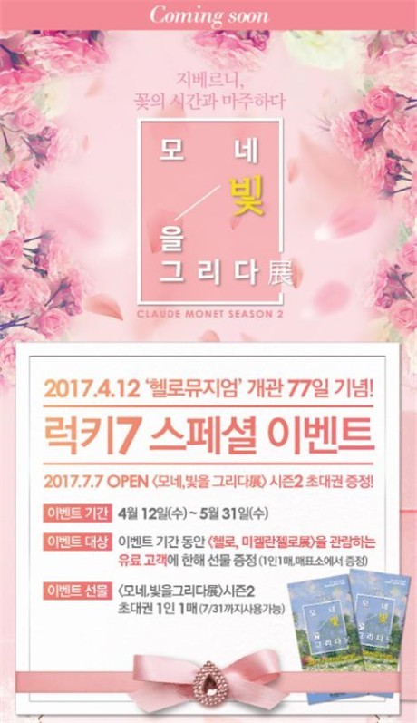 이번 이벤트는 4월 12일부터 5월 31일까지 헬로뮤지엄을 방문하면 '모네, 빛을그리다展' 시즌2 초대권을 증정하는 특별행사이다.