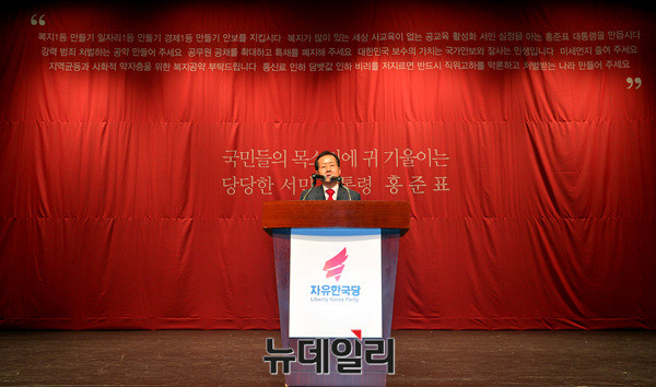 홍준표 자유한국당 대선후보가 11일 오후 서울 양재동 더케이아트홀에서 열린 중안선거대책위원회 핵심선거대책위원 전체회의에 참석해 연설을 하고 있다.