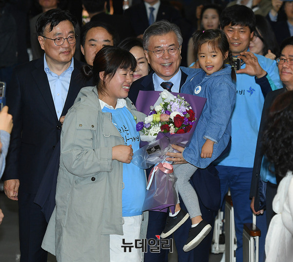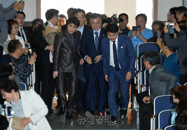문재인 더불어민주당 대선후보가 11일 오후 울산 남구 울산상공회의소에서 열린 울산 비전 기자회견에 입장하며 지지자들과 인사를 나누고 있다. 문 후보는 앞서 부산 벡스코를 방문해 부산 선대위 발대식에 참석했다. 문 후보는 이날 오후 예정이던 비공개 회의를 취소하고, 안보 점검회의를 소집했다. (울산=뉴데일리 정상윤 기자)