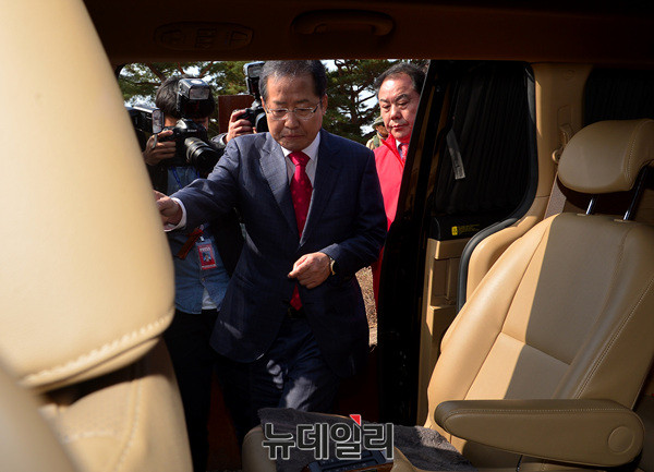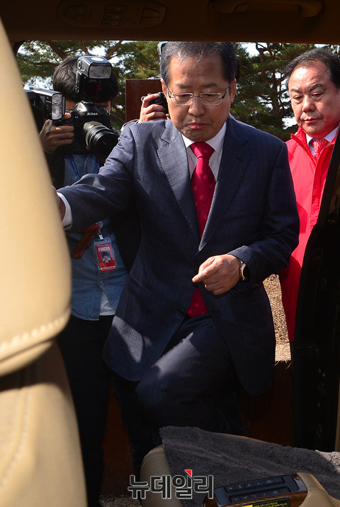 홍준표 자유한국당 대선후보가 11일 오전 경기도 파주시 임진각을 방문을 마치고 포천시장 보궐 선거에 출마한 김종천 후보, 김성남 도의원 후보 지원 유세를 위해 차에 오르고 있다. 홍 후보는 임진각을 방문하기 앞서 판문점을 찾아 안보태세를 점검했다.