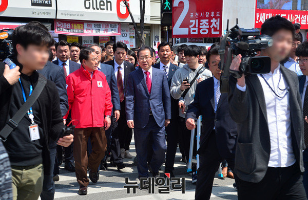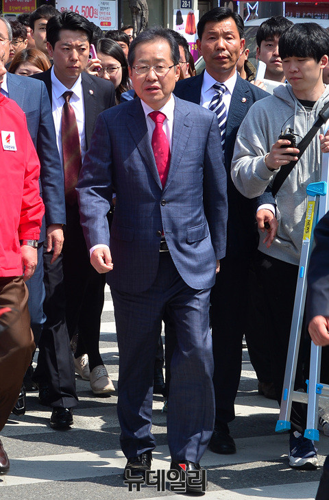 포천시장 보궐 선거에 출마한 김종천 후보, 김성남 도의원 후보 지원 유세에 나선 홍준표 자유한국당 대선후보가 11일 오전 경기도 포천시 송우시장에서 지원 유세를 마친 후 이동하고 있다.