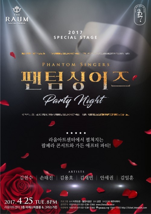 국내 최초 소셜베뉴 라움아트센터가 '팬텀싱어즈 파티 나이트' 공연의 프로그램과 애프터 파티 이벤트를 공개했다.4월 25일 오후 8시부터 진행되는 '팬텀싱어즈 파티 나이트'는 JTBC '팬텀싱어' 우승팀 '포르테 디 콰트로'의 김현수, 손태진과 국내 최정상 팝페라 아티스트 벨트라움이 함께하는 최초의 공연이다.이번 공연에서 김현수와 손태진은 '팬텀싱어'에 출연하기 전부터 오랜 시간 함께했던 멤버들이 모여 특별한 무대를 준비했다. 김현수는 오페라 도니제티의 '사랑의 묘약' 중 '남몰래 흘리는 눈물'을 선보이며, 손태진은 솔로곡과 더불어 김현수와 듀엣곡을 준비하고 있다.공연이 끝난 뒤에는 라움아트센터의 청량한 가든에서 맥주와 함께 즐기는 애프터 파티가 열린다. 전 아티스트가 참여하는 애프터 파티는 관객이 직접 궁금한 점을 작성한 카드를 추첨해 이야기를 나누고, 럭키드로우 이벤트를 이어갈 예정이다.한편, 라움아트센터는 공연 2시간 전인 오후 6시 티켓을 오픈하고, 라움의 가든을 즐길 수 있는 카페테라스를 한시적으로 운영한다. 관객들은 공연에 앞서 웰컴 드링크와 간단한 식사를 먹을 수 있다'팬텀싱어즈 파티 나이트'는 1차 티켓 오픈 당시 R석이 1분 만에 매진됐으며, 2차 공개된 R·S석에 한해 인터파크에서 예매 가능하다. 문의 라움아트센터 02-538-3366.