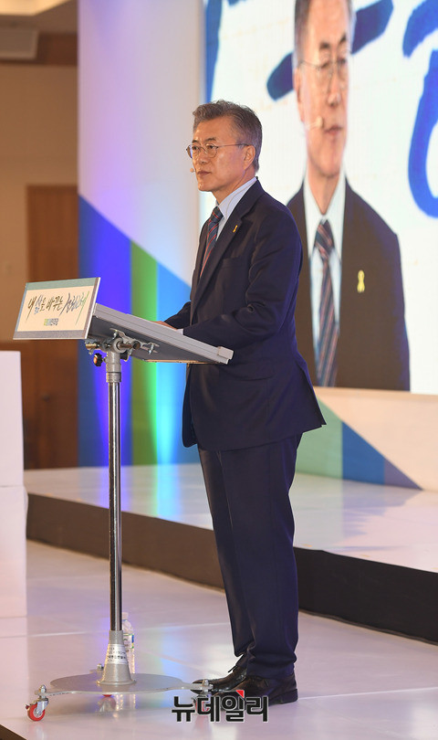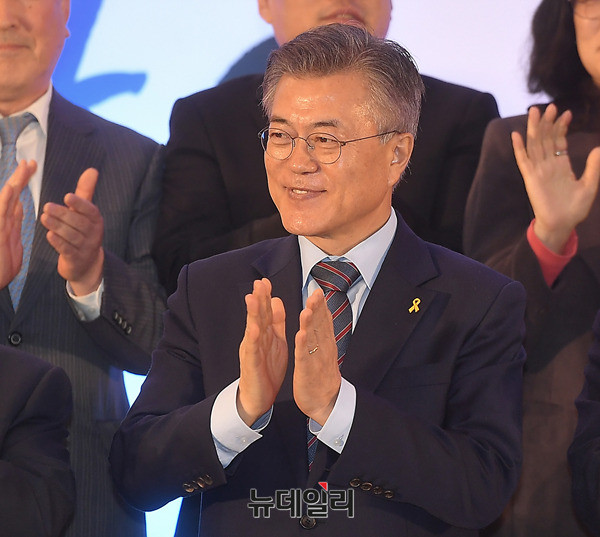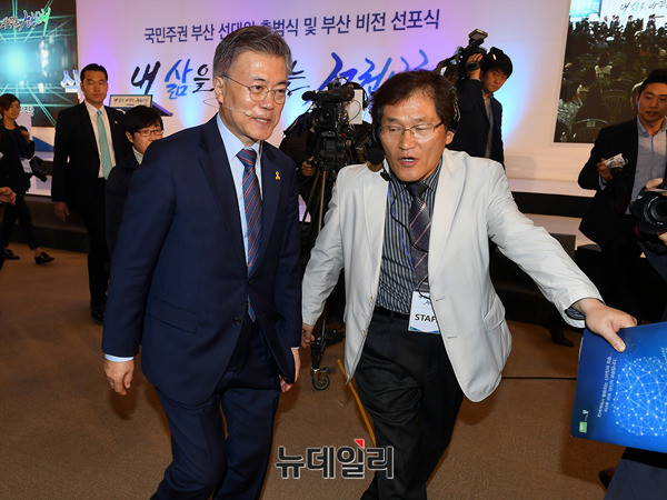 문재인 더불어민주당 대선후보가 11일 오후 부산 벡스코 컨벤션홀에서 열린 부산 선대위 출범 및 부산 비전 발표식에서 선대위원들과 악수를 나누고 있다. 문 후보는 이어 범어사 더문캠 불교특위 출범법회와 울산 비전 기자회견에 각각 참석했다. (부산=뉴데일리 정상윤 기자)