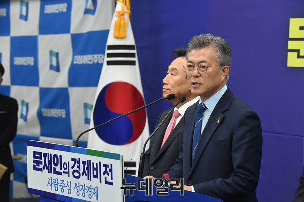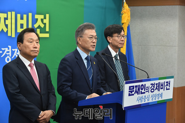 더불어민주당 문재인 대선후보가 12일 오전 서울 여의도 당사에서 기자회견을 갖고 경제정책 관련 공약을 발표하고 있다.