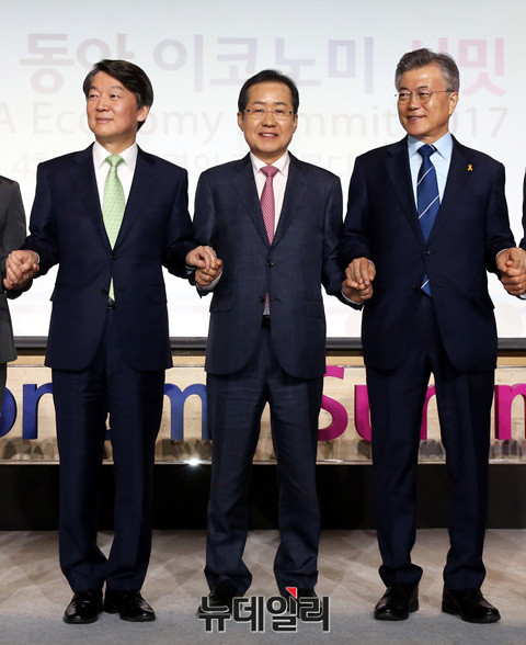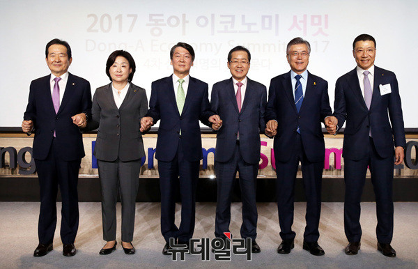 홍준표 자유한국당, 문재인 더불어민주당, 안철수 국민의당, 심상정 정의당 대선후보가 12일 오전 서울 여의도 전경련회관에서 열린 '2017 동아 이코노미 서밋:4차 산업혁명의 길을 묻다'에 참석해 기념 촬영을 하고 있다. (사진=공동취재단)