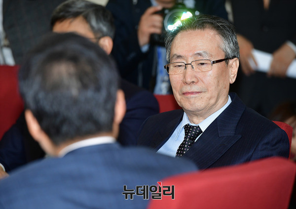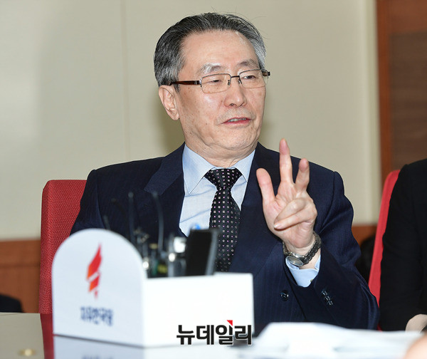 우다웨이 중국외교부 한반도 특별대표가 12일 오후 서울 영등포구 자유한국당사에서 홍준표 대선후보를 만나 대담 중 미소를 짓고 있다. 홍 후보는 앞서 서울 용산구 전쟁기념관에서 백선엽 장군을 예방하고 안보행보를 이어갔다.