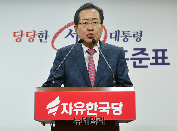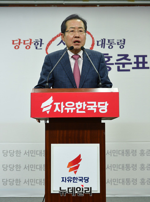 홍준표 자유한국당 대선후보가 12일 오후 서울 영등포구 자유한국당사에서 우다웨이 중국 한반도 사무특별대표를 만난 직후 브리핑을 하고 있다. 홍 후보는 앞서 서울 용산구 전쟁기념관에서 백선엽 장군을 예방했다.