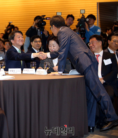 홍준표 자유한국당 대선후보와 안철수 국민의당 대선후보가 12일 오전 서울 여의도 전경련회관에서 열린 '2017 동아 이코노미 서밋:4차 산업혁명의 길을 묻다'에 참석해 기념 촬영을 하고 있다.