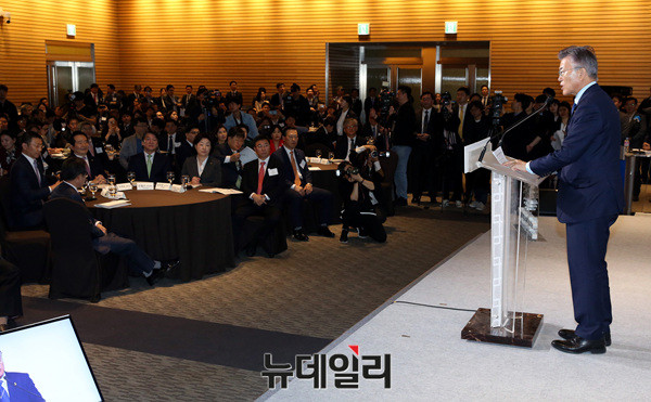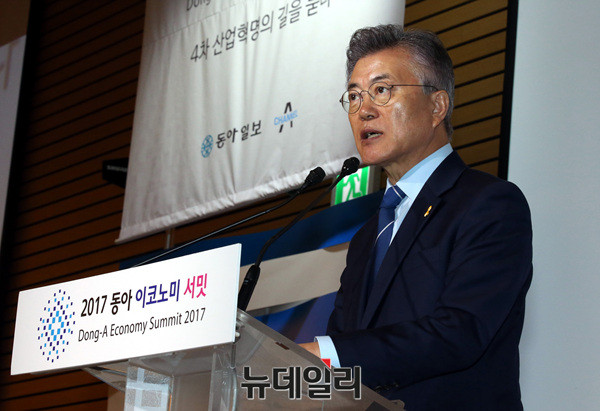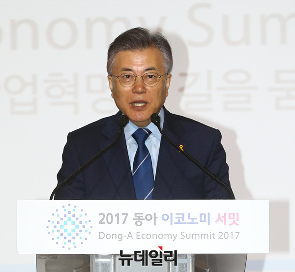 문재인 더불어민주당 대선후보가 12일 오전 서울 여의도 전경련회관에서 열린 '2017 동아 이코노미 서밋:4차 산업혁명의 길을 묻다'에 참석해 축사를 하고 있다.