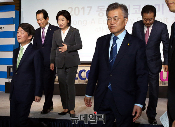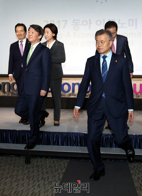 홍준표 자유한국당, 문재인 더불어민주당, 안철수 국민의당, 심상정 정의당 대선후보가 12일 오전 서울 여의도 전경련회관에서 열린 '2017 동아 이코노미 서밋:4차 산업혁명의 길을 묻다'에서 기념 촬영을 마친 후 이동하고 있다. (사진=공동취재단)