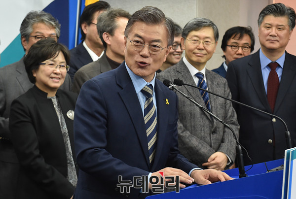 문재인 더불어민주당 대통령 후보가 13일 서울 여의도 당사에서 민주정책통합포럼 출범 기자회견을 갖고 있다.