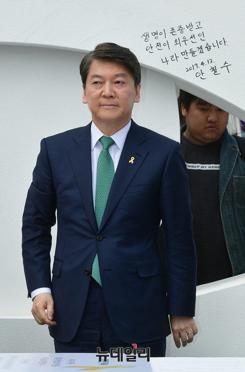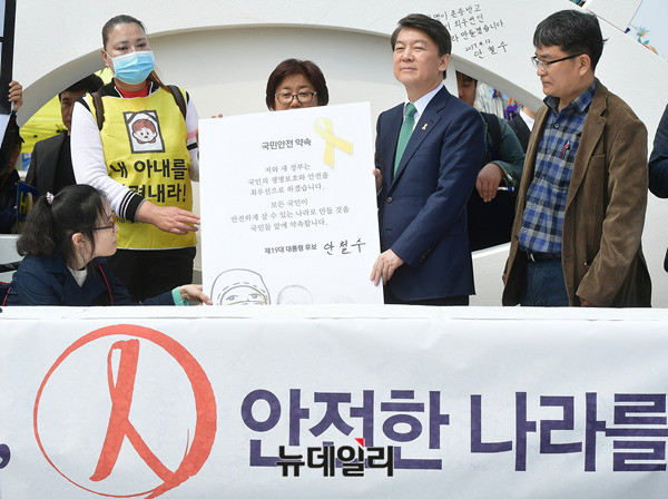 안철수 국민의당 대선후보가 13일 오후 광화문 광장을 찾아 시민단체가 주최한 안전한나라를위한대국민약속 서약식에 참석해 요구사항을 듣고 있다. 이 자리에는 국민의당 안철수 후보, 정의당 심상정 후보, 더불어민주당 문재인 후보가 차례로 방문해 세월호 희생자를 추모하고, 서약식에 참석했다.