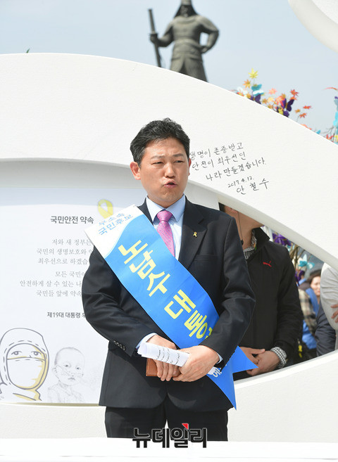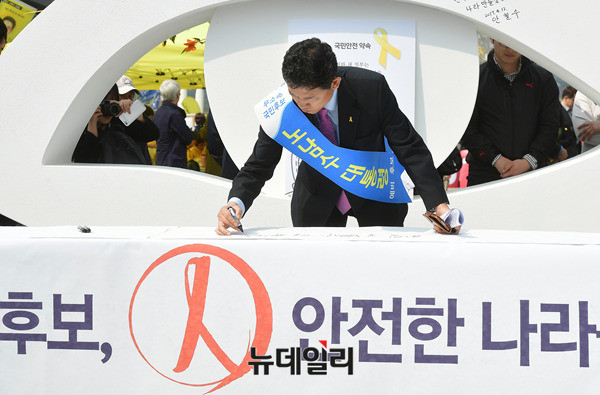 무소속 노남수 대선예비후보가 13일 오후 광화문 광장에서 열린 안전한나라를위한대국민약속 서약식에 참석해 취재진들에게 무소속 후보에 대한 관심을 가져줄것을 호소하고 있다. 노 후보는 주최 측에서 서약서를 내주지 않자 테이블에 깔린 종이에 메시지를 적었다.