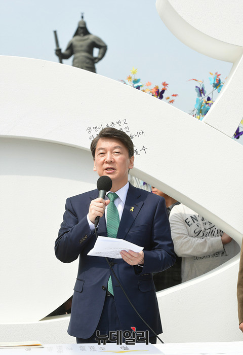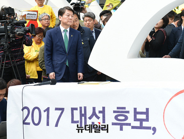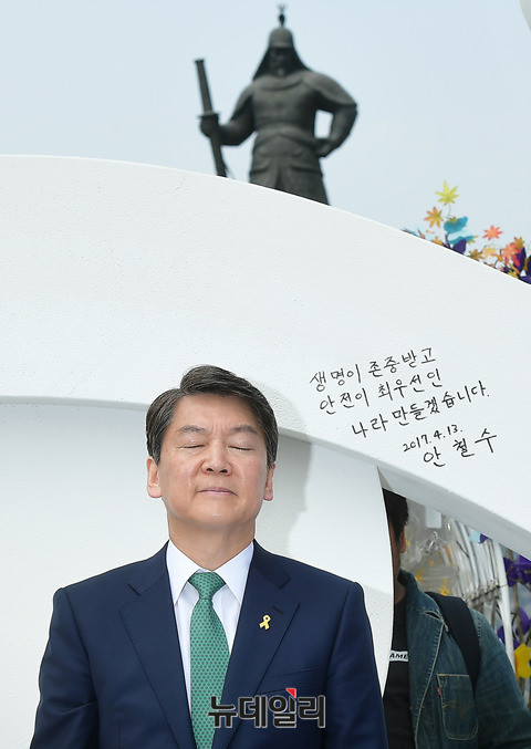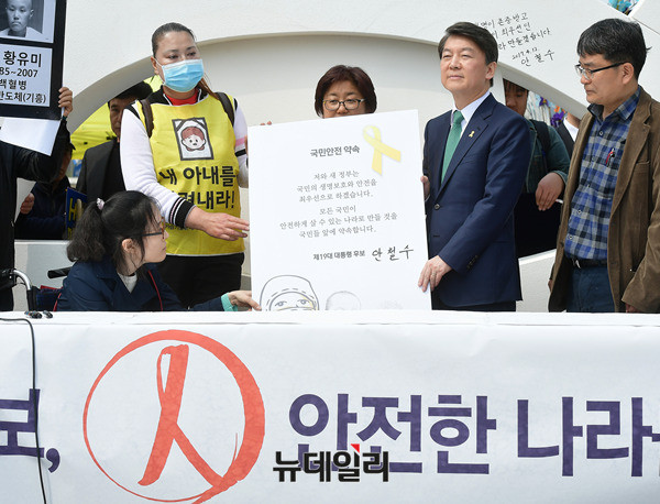 안철수 더불어민주당 대선후보가 13일 오후 광화문 광장을 찾아 시민단체가 주최한 안전한나라를위한대국민약속 서약식에 참석해 조형물에 메시지를 적고 앞을 응시하고 있다.