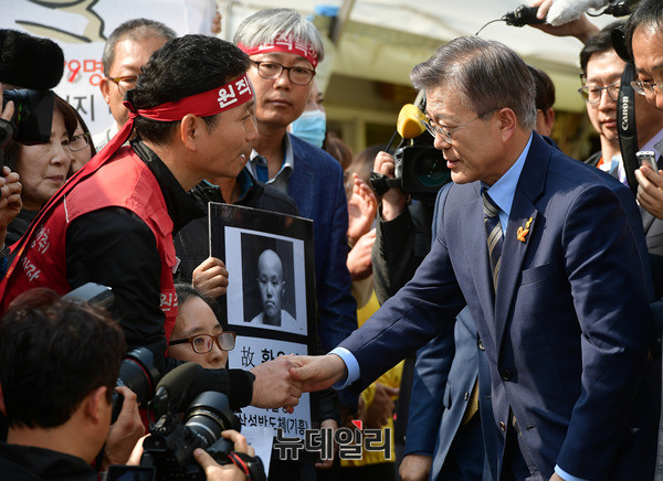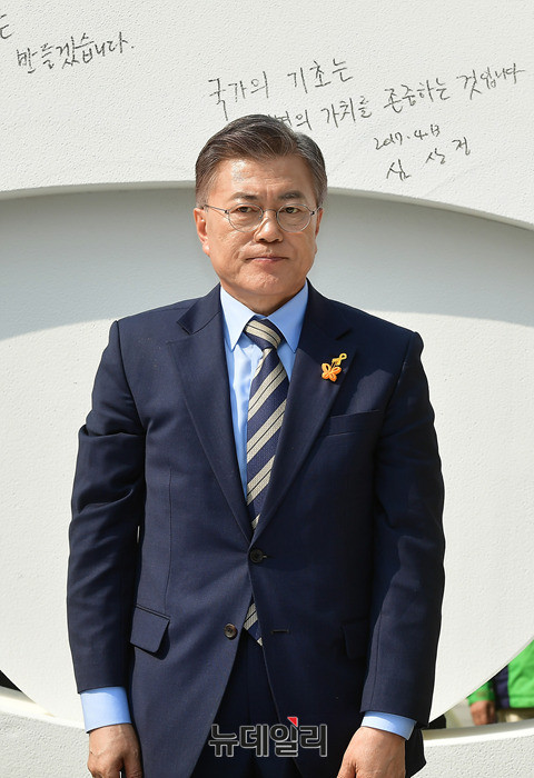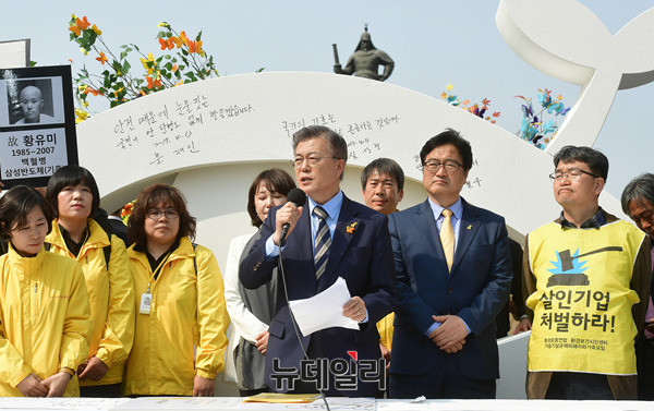 문재인 더불어민주당 대선후보가 13일 오후 광화문 광장을 찾아 시민단체가 주최한 안전한나라를위한대국민약속 서약식에 참석해 발언하고 있다. 이 자리에는 국민의당 안철수 후보, 정의당 심상정 후보, 더불어민주당 문재인 후보가 차례로 방문해 세월호 희생자를 추모하고, 서약식에 참석했다.