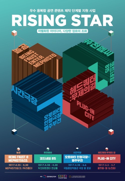 문화체육관광부와 한국콘텐츠진흥원(KOCCA, 이하 한콘진)의 융복합 공연 콘텐츠 제작지원 사업인 '라이징 스타(RISING STAR)'를 통해 제작된 신작 4편이 4~5월 관객들을 찾아간다.