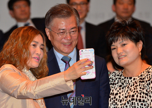 문재인 더불어민주당 대선후보가 14일 오전 한국프레스센터 국제회의장에서 열린 '제19대 대통령후보 초청 특별강연회'에서 참석자와 사진을 찍고 있다.