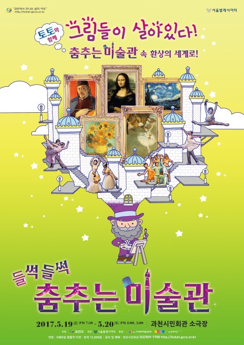 가족발레 '들썩들썩 춤추는 미술관'은 5월 19일 오전 11시와 20일 오후 2시, 5시에 과천시민회관 소극장에서 공연된다. 예매는 인터파크 티켓과 과천시민회관을 통해 할 수 있다. 전석1만5천원. 문의 02-504-7300.