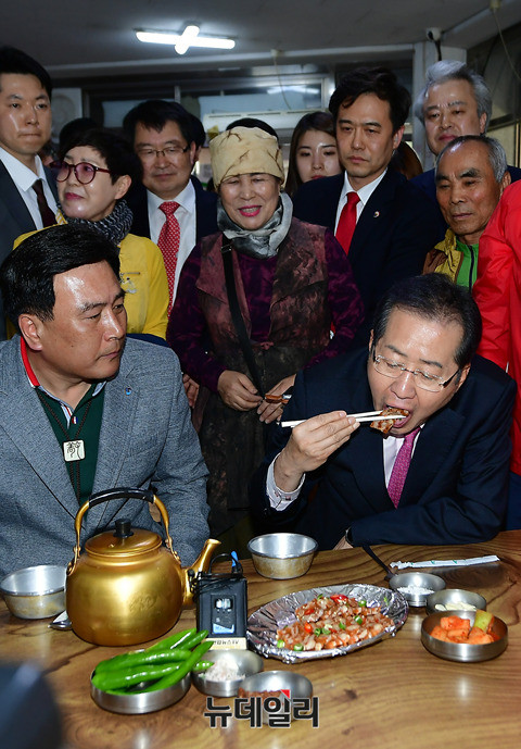홍준표 자유한국당 대선후보가 14일 오후 경북 안동시 중앙신시장을 찾아 상인회장과 닭발편육과 막걸리를 맛보고 있다. 홍 후보는 이어 안동유림과의 간담회에 참석하고, 대구지역 청년소상공인을 찾아 TK지역 표심을 잡을 예정이다. (경북 안동=뉴데일리 정상윤 기자)