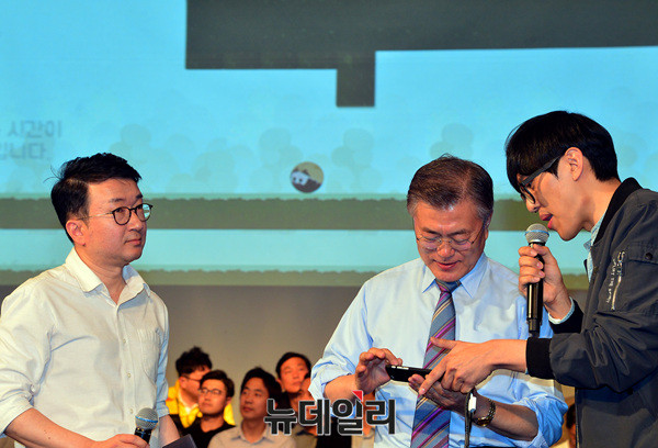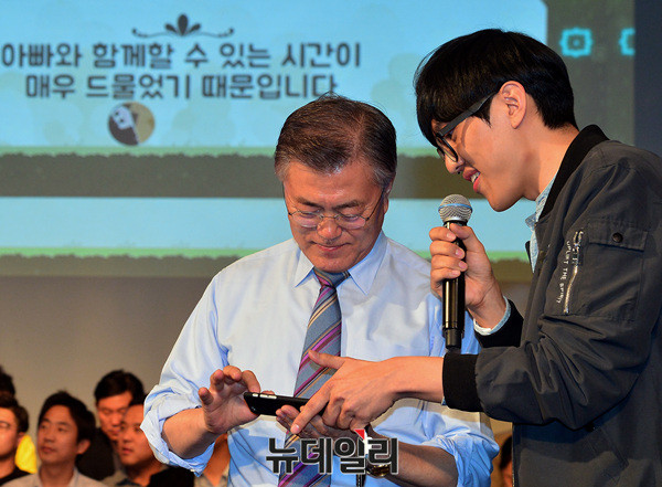 문재인 더불어민주당 대선후보가 14일 오후 서울 강남구 GS타워에서 열린 '미래성장과 일자리 창출을 위한 디지털경제 국가전략 초청 포럼'에서 게임을 시연하고 있다.