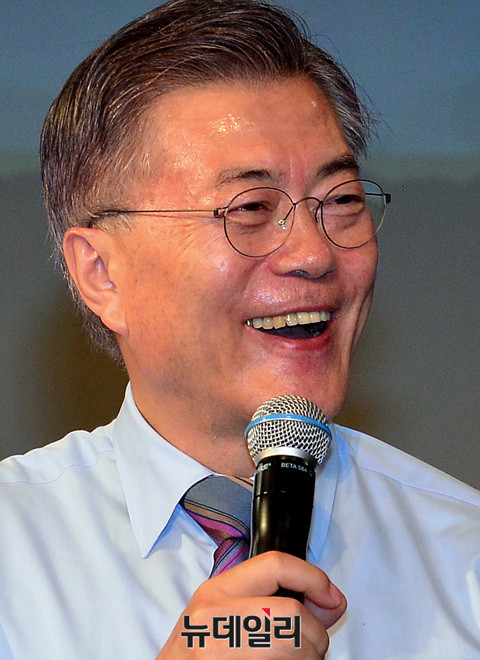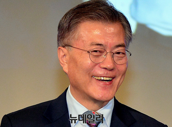 문재인 더불어민주당 대선후보가 14일 오후 서울 강남구 GS타워에서 열린 '미래성장과 일자리 창출을 위한 디지털경제 국가전략 초청 포럼'에서 미소 짓고 있다.
