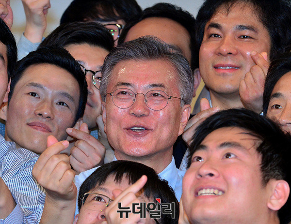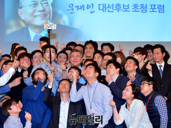 문재인 더불어민주당 대선후보가 14일 오후 서울 강남구 GS타워에서 열린 '미래성장과 일자리 창출을 위한 디지털경제 국가전략 초청 포럼'에서 기념촬영을 하고 있다.