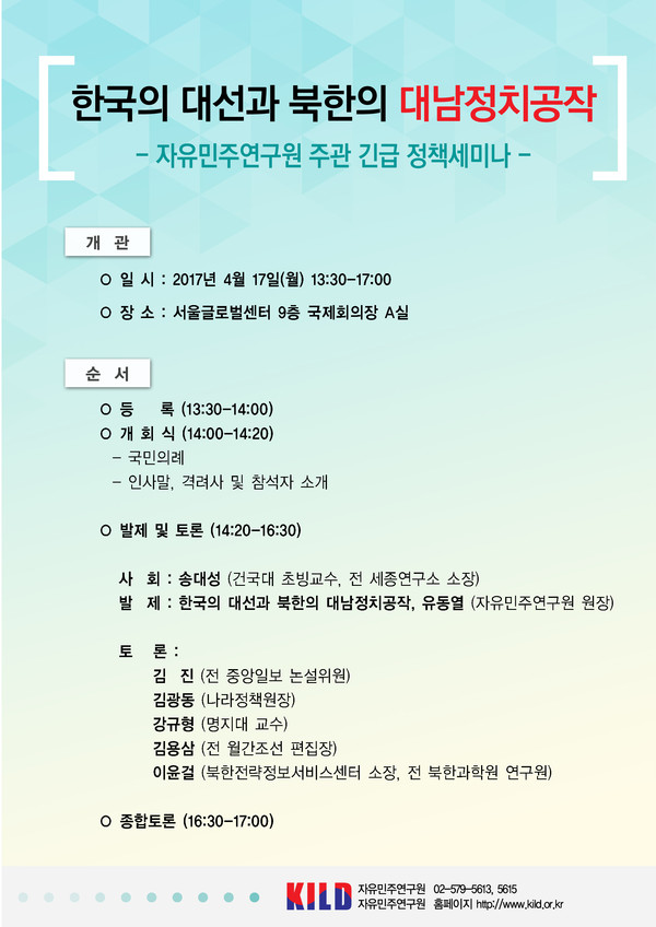 자유민주연구원(원장 유동열)은 2017년 4월 17일(월) 서울글로벌센터 9층 국제회의장에서 "한국의 대선과 북한의 대남정치공작"을 주제로 긴급정책세미나를 개최합니다. 많은 참여와 관심과 성원 부탁드립니다.