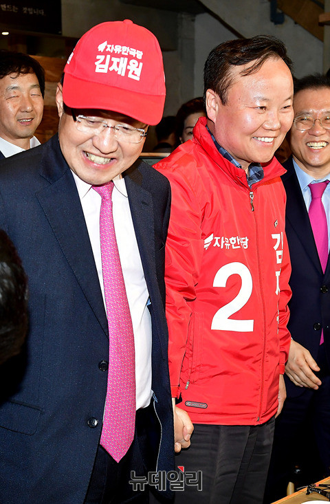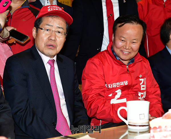 홍준표 자유한국당 대선후보가 14일 오후 대구 중구 김광석다시그리기길을 방문해 최근 상주·군위·의성·청송 지역구 재보궐 선거에서 당선된 김재원 의원과 만나 포옹하고 있다. 홍 후보는 이날 안동과 대구를 찾아 TK 표심을 공략했다. (대구=뉴데일리 정상윤 기자)