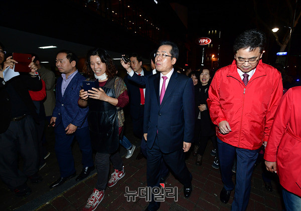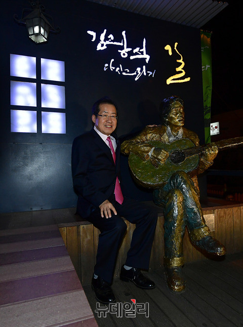 홍준표 자유한국당 대선후보가 14일 오후 대구 중구 김광석다시그리기길을 방문해 입구에 설치된 김광석 조형물에서 기념 사진을 찍고 있다. 홍 후보는 이날 안동과 대구를 찾아 TK(대구·경북) 표심을 공략했다. (대구=뉴데일리 정상윤 기자)