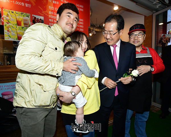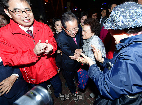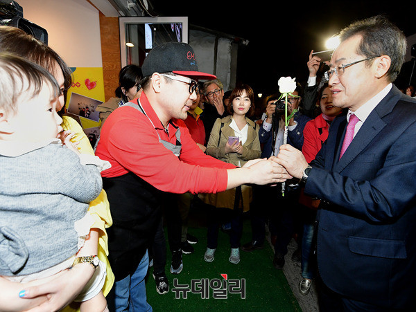 홍준표 자유한국당 대선후보가 14일 오후 대구 중구 김광석다시그리기길을 방문해 시민에게 장미꽃을 받고 있다. 이 거리에서 기다리고 있던 지지자들은 홍 후보가 등장하자 꽃다발을 전달하기도 했다. 앞서 홍 후보는 이날 안동과 대구를 찾아 TK(대구·경북) 표심을 공략했다. (대구=뉴데일리 정상윤 기자)