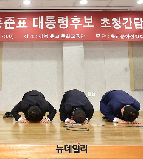홍준표 자유한국당 대선후보가 14일 오후 경북 안동시 경북유교문화교육관에서 열린 안동유림 간담회에 앞서 백승주(왼쪽), 김광림(오른쪽) 의원과 함께 큰절을 하고 있다. 이날 홍 후보는 안동중앙신시장과 대구지역 청년소상공인과 김광석다시그리기길을 찾아 TK(대구·경북)지역 표심을 공략했다. (경북 안동=뉴데일리 정상윤 기자)