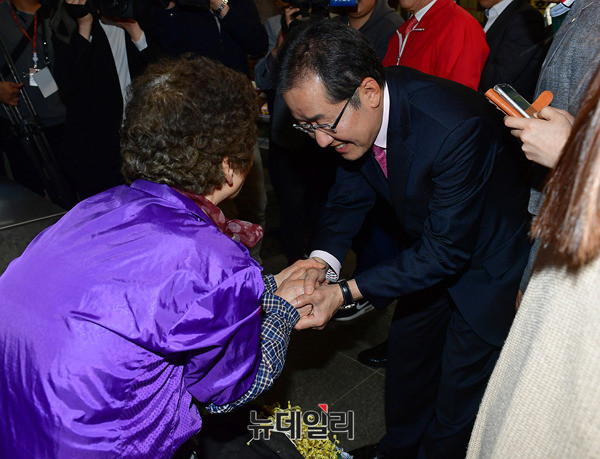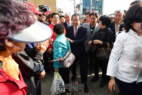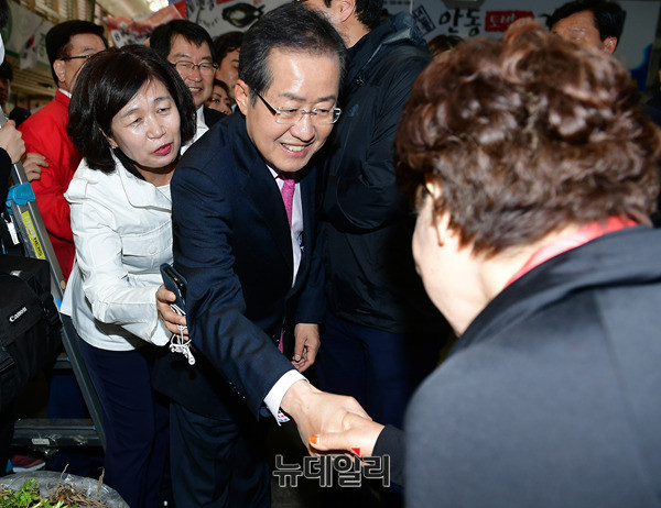 홍준표 자유한국당 대선후보가 14일 오후 경북 안동시 중앙신시장을 찾아 입구에서 시민들과 악수하며 입장하고 있다. 이날 홍 후보는 이어 안동유림과의 간담회에 참석했다. 또 대구지역 청년소상공인과 김광석다시그리기길을 찾아 TK(대구·경북)지역 표심을 공략했다. (경북 안동=뉴데일리 정상윤 기자)