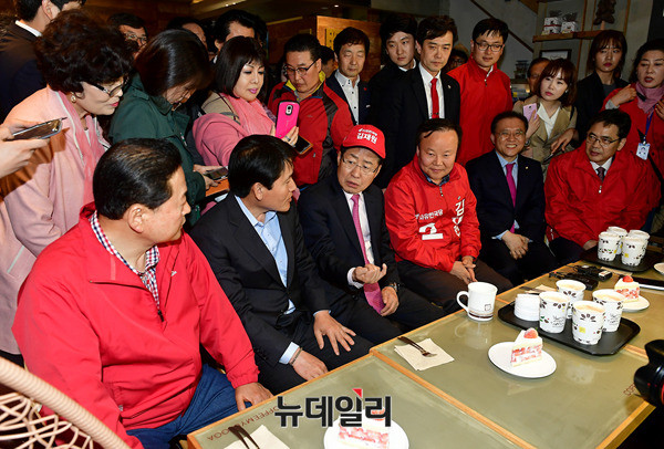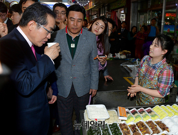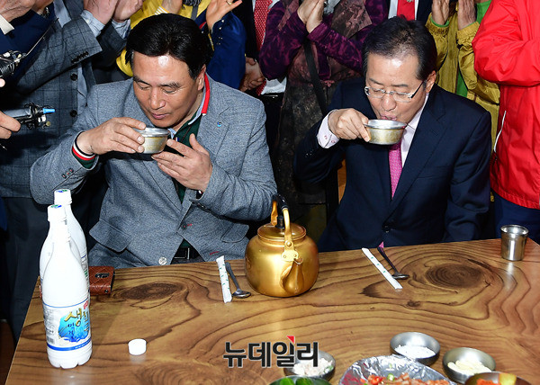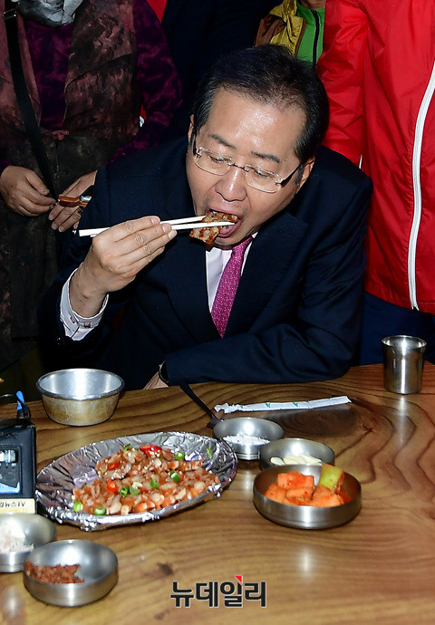 앞서 홍 후보는 안동중앙신시장을 방문해 닭발편육과 막걸리 한 사발을 마셨다. 시장을 돌며 상인이 건낸 떡도 먹었다. 최근 재보궐 선거에서 당선된 김재원 의원을 만난 대구의 김광석길의 커피숍에서는 조각케이크와 커피를 미리 주문해 놨지만 물만 마셨다.