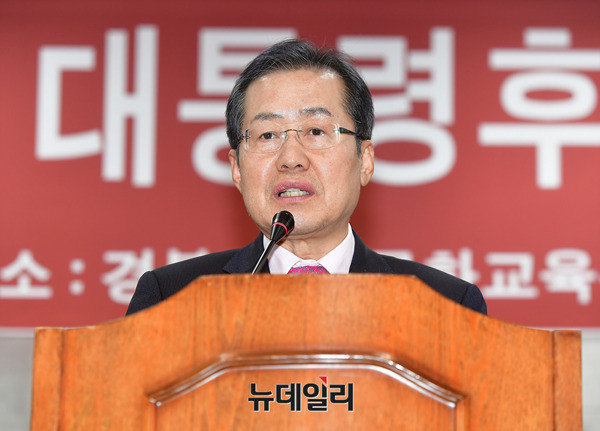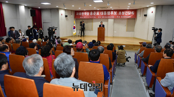 홍준표 자유한국당 대선후보가 14일 오후 경북 안동시 경북유교문화교육관에서 열린 안동유림 간담회에서 모두 발언을 하고 있다. 홍 후보는 발언 전 백승주, 김광림 의원과 함께 큰절을 올렸다. 이날 홍 후보는 안동중앙신시장과 대구지역 청년소상공인과 김광석다시그리기길을 찾아 TK(대구·경북)지역 표심을 공략했다. (경북 안동=뉴데일리 정상윤 기자)