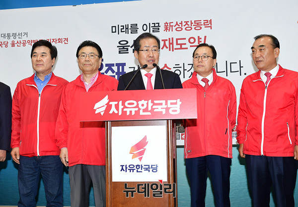 홍준표 자유한국당 대선후보가 15일 오전 울산시청 프레스센터에서 울산지역 공약과 관련한 기자회견을 열고 △신산업기반 조성 △안전도시 구축 △초일류 조선해양도시 재건 △울산권 '원스톱' 광역교통인프라 구축 △산업과 역사·문화가 공존하는 영남권 대표 복합관광도시 육성 등 울산의 도약 위한 비전을 제시했다. (울산=뉴데일리 정상윤 기자)