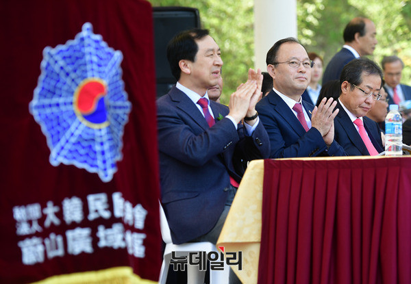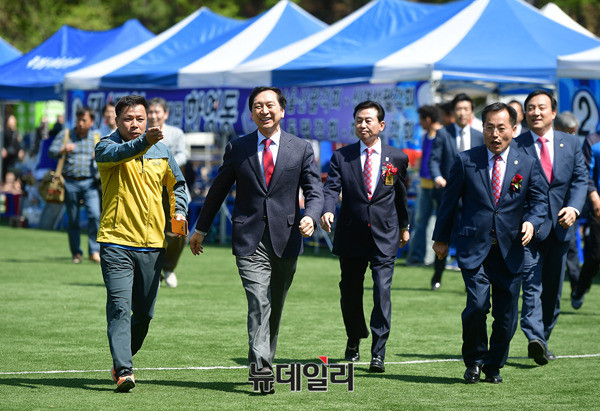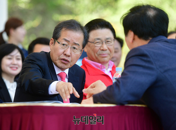 홍준표 자유한국당 대선후보와 김기현 울산시장이 15일 오전 울산 선암호수공원에서 열린 팔각인한마음체육대회에 참석해 대화를 나누고 있다. 앞서 홍 후보는 울산시청에서 기자회견을 열고, 울산지역 공약을 발표했다. (울산=뉴데일리 정상윤 기자)