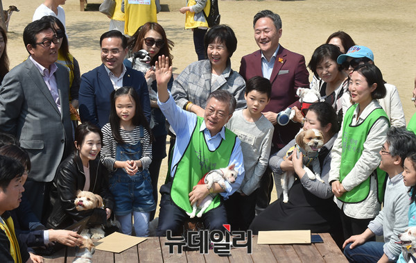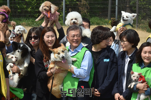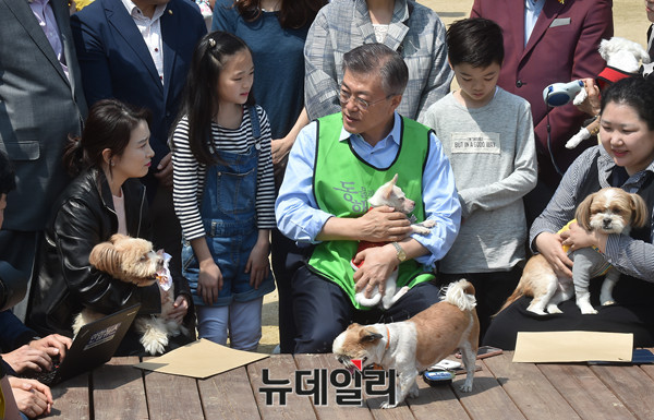 문재인 더불어민주당 대선후보가 15일 오후 서울 마포구 월드컵공원 내 반려견 놀이터에서 반려동물 정책 발표하고 시민들의 정책제안을 듣고 있다.