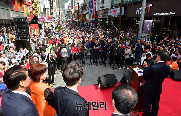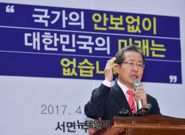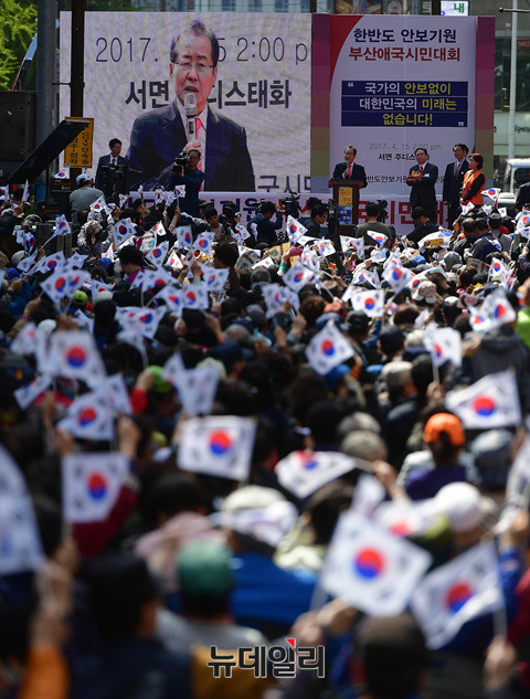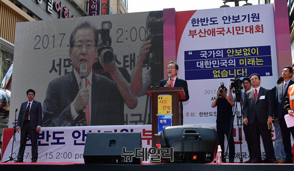 홍준표 자유한국당 대선후보가 15일 오후 부산 부산진구 주디스 태화백화점 앞에서 열린 부산애국시민대회에 참석해 안보관련 발언을 하고 있다. 이날 울산에 이어 부산을 찾은 홍 후보는 부산항대교 전망대에서 부산비전 공약을 발표를 했다. (부산=뉴데일리 정상윤 기자)